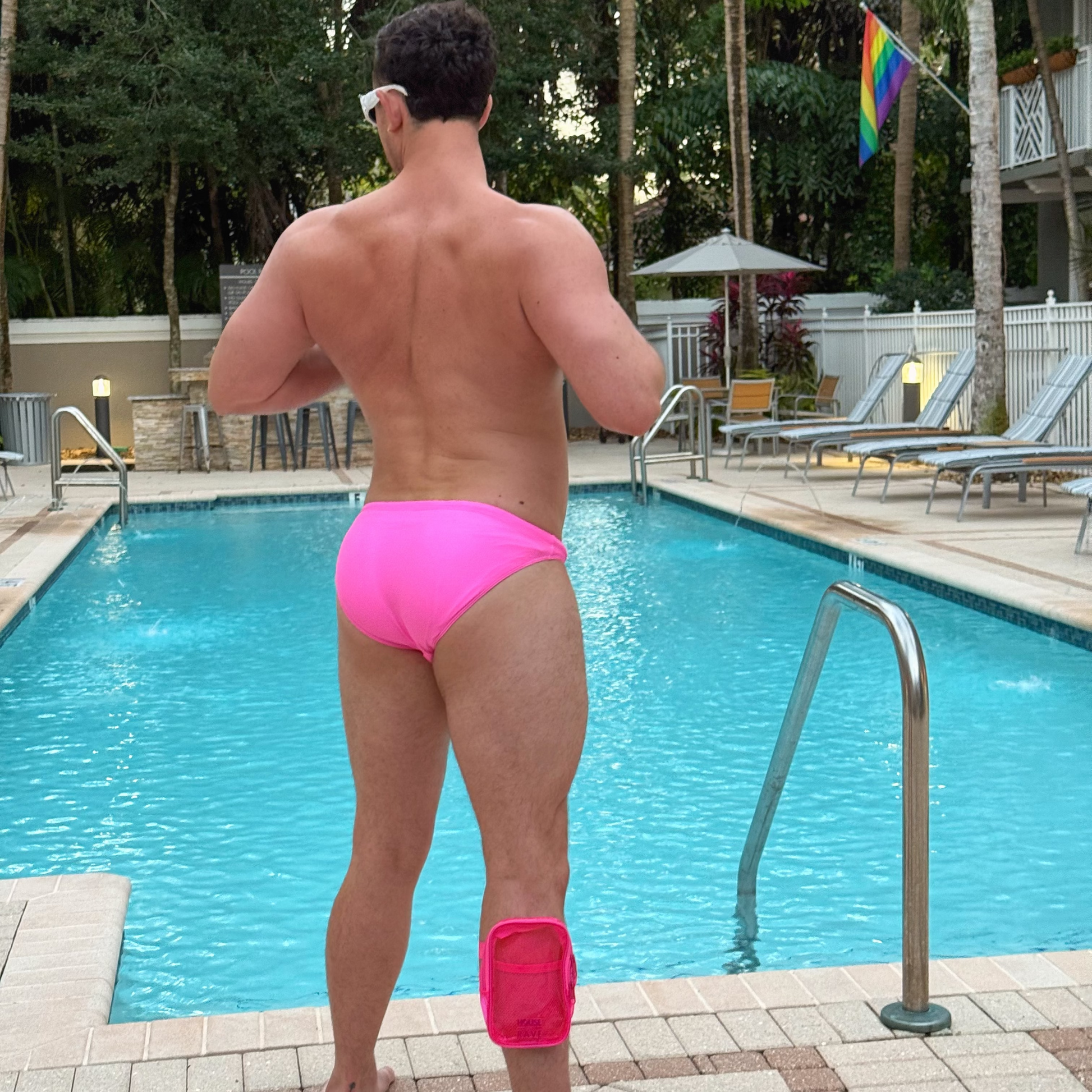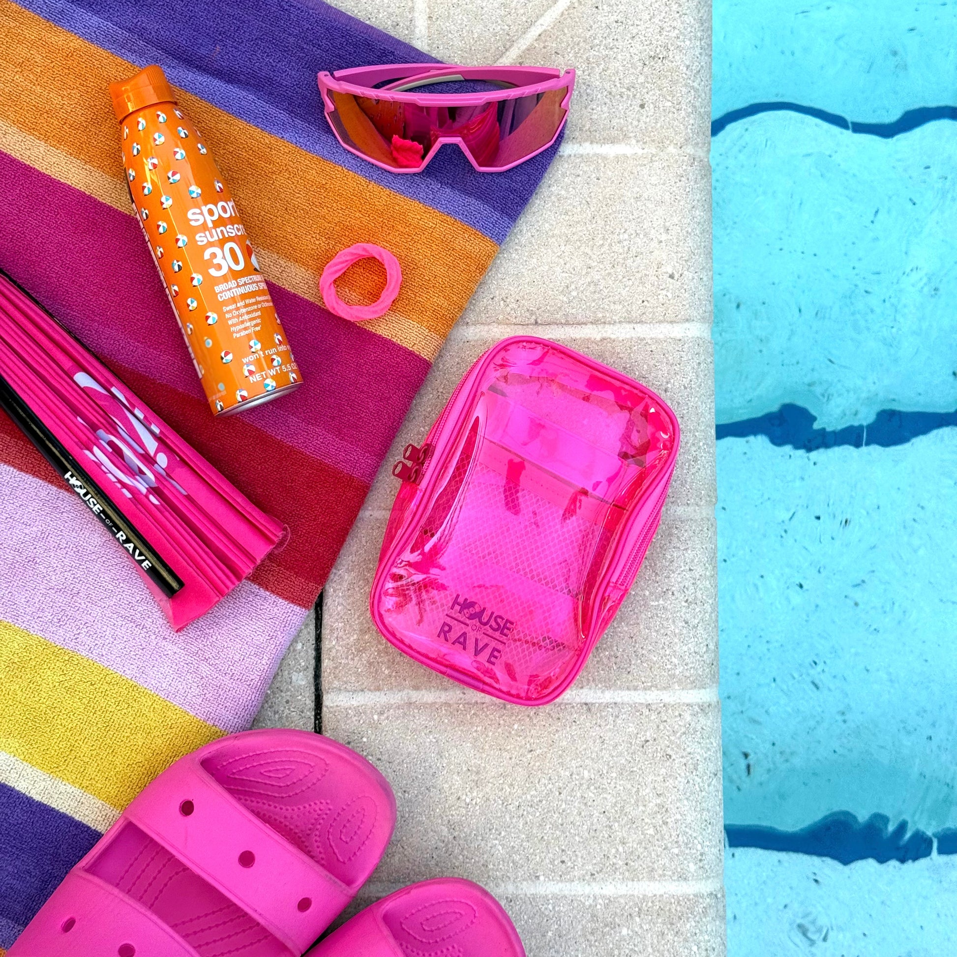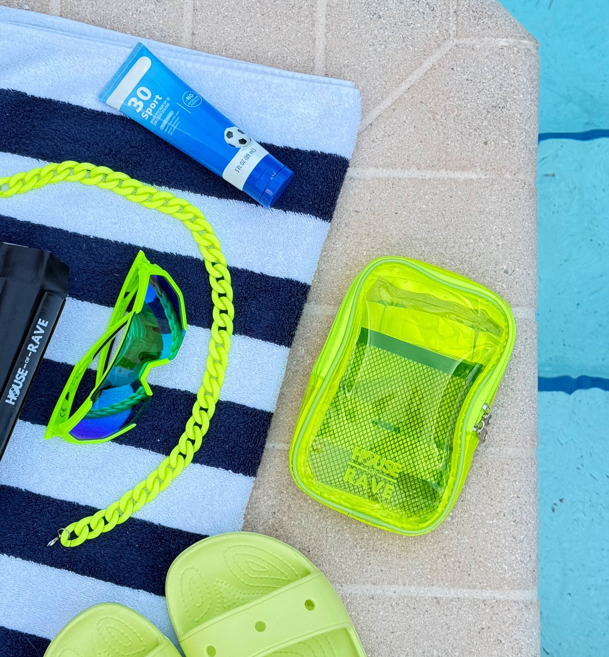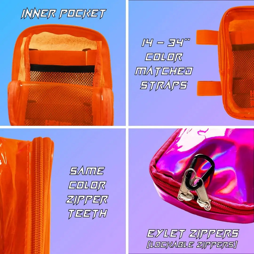 Depending on your arm size it could also be worn as an arm bag. The clear festival thigh bag has no clips so there's no chance of someone quietly snatching it off you, providing peace of mind against theft while you dance the night away. Each rave thigh bag has double eyelet zippers that you can quickly clip together with a carabiner clip or other locking device for extra security. The new leg bags have a spacious main pocket, and an inner mesh pocket, it's perfect for storing your essentials such as your phone, wallet, keys, and more. Your jelly festival thigh bag keeps you organized and hands-free as you immerse yourself in the festival experience. Whether you're grooving to the music or capturing unforgettable moments, our clear thigh bag keeps your belongings safe and secure while adding a touch of futuristic flair to your ensemble.