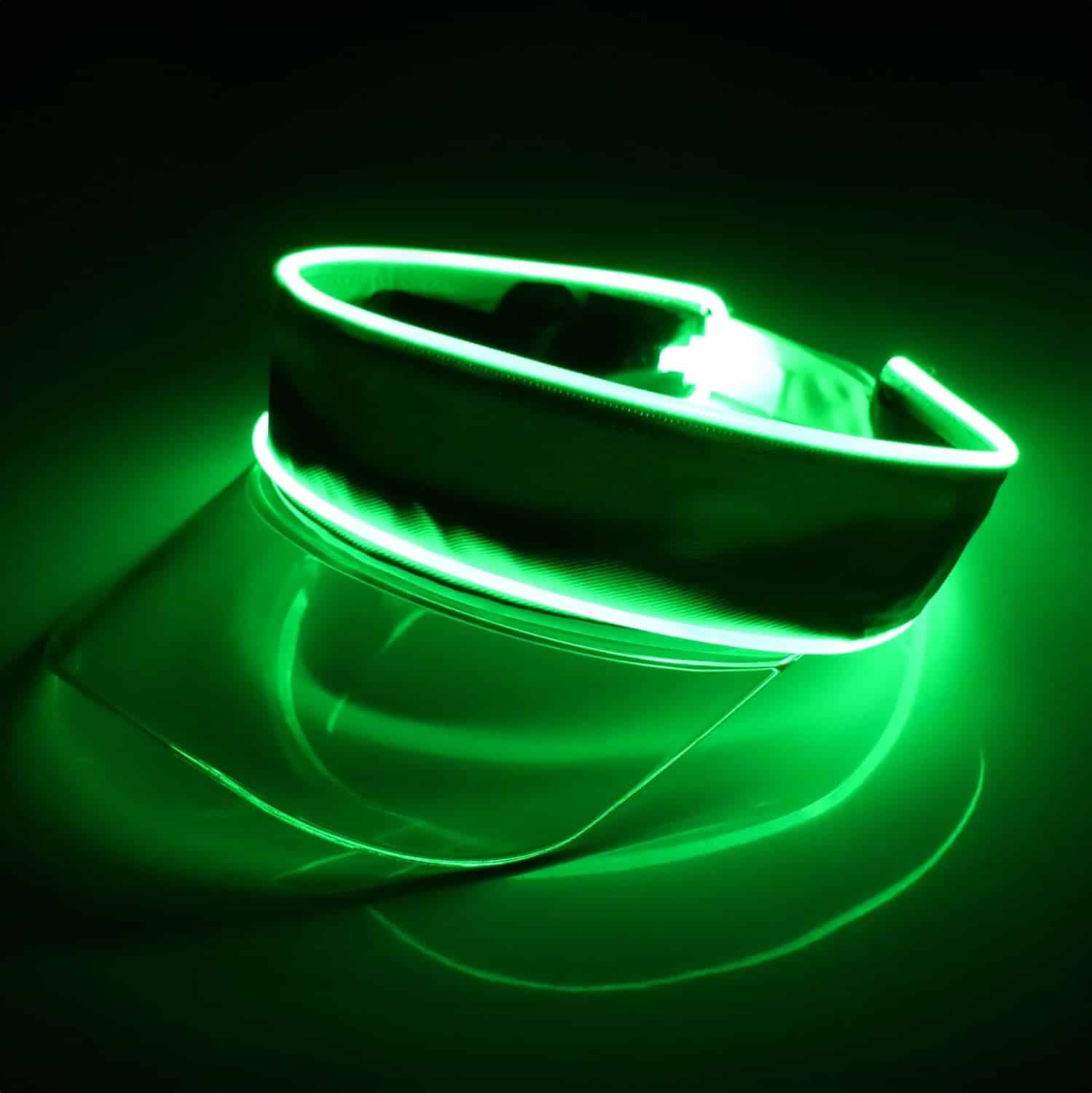 The LED neon visor has a long lasting rechargeable battery that provides 8+ hrs of light. Neon light up visor comes with micro USB cord (wall block not included).Adjustable LED Neon Visor
