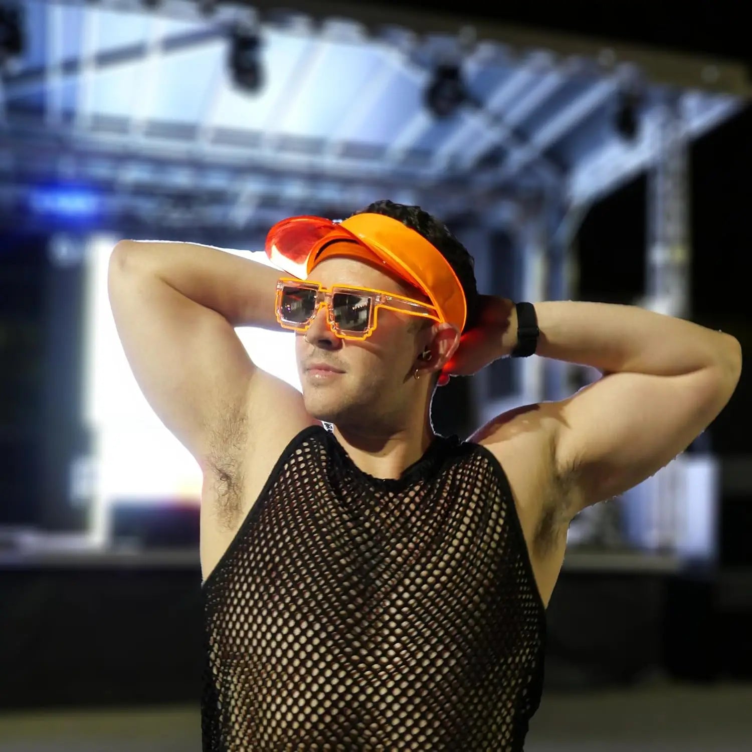 Light up neon retro visors are the perfect festival accessory. Make your LED neon visor match the tempo of the music or your mood with one of the lighting modes. LED neon visors are the latest essential rave accessory, blending futuristic flair with practicality under the pulsating lights of the function. These vibrant headpieces not only shield your eyes from glare but also illuminate your presence with an electrifying glow, reminiscent of iconic pop culture figures like Daft Punk's legendary helmet. As you immerse yourself in the rhythm and energy of the rave, the LED neon visor becomes a beacon of festival style, guiding you through the night with unmatched charisma and flair. Embrace the spirit of the rave scene with this must-have rave accessory that adds a touch of sci-fi chic to your ensemble, ensuring you shine as brightly as the laser lights above. Match your LED neon visor with one of our light up chest bags or the Pixel LED sunglasses for a cohesive look.